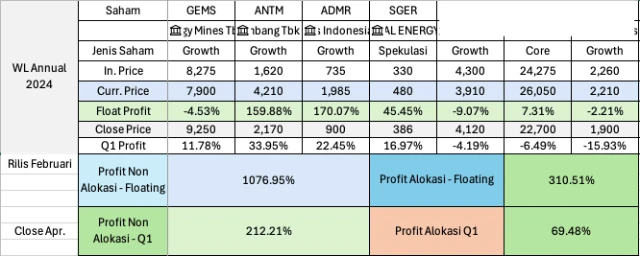 1. Annual 2024 - Jika kita hitung total profit tanpa alokasi (sama rata dalam hitungan model) maka sampai penutupan WL selanjutnya (Q1 2025) yang berarti harga penutupan April maka total profit 212% dengan versi realistis (alokasi) 69%.